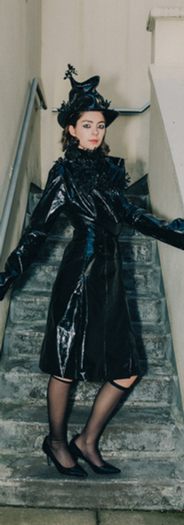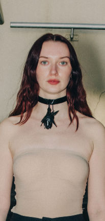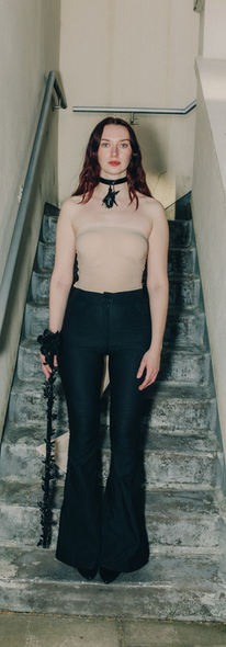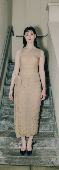 and memory. In this collection, Davies focuses on the Chalice Well, imagining its waters as a portal: pulled into the Victorian era in which the well was designed, a time when industry and transport were powered by horses. This reinforces the enduring presence of the equestrian theme throughout Davies’ practice. The Chalice Well is steeped in legend: it is said to be where Joseph of Arimathea placed his staff, marking the site as a sacred threshold between the earthly and the mystical. Davies reflects: “If my companions and I were to take a trip to the well and tumble in, understood as a portal between temporalities, what garments might we emerge wearing? For the female body, for ourselves, what forms might be conjured through this
